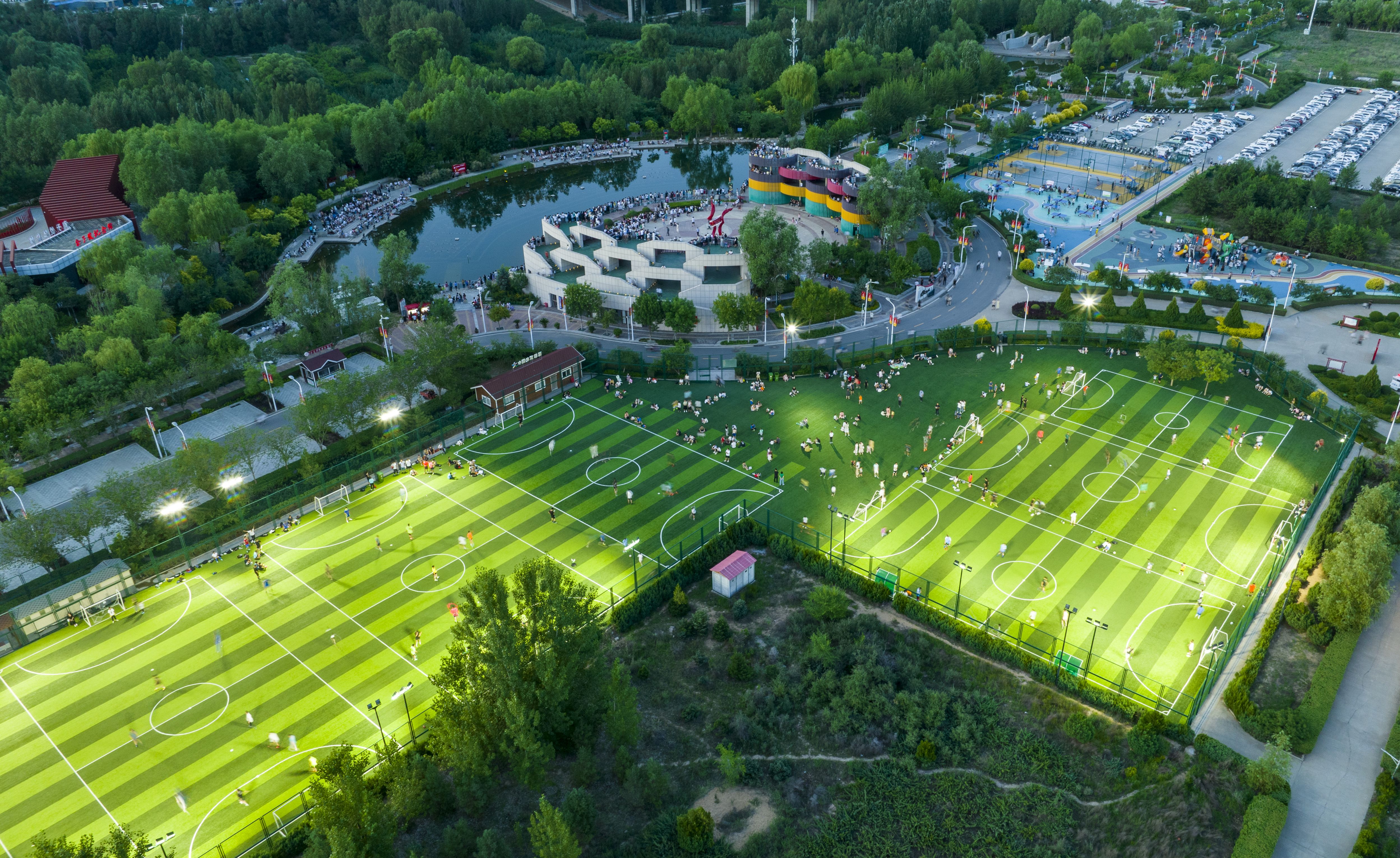 8月8日,在榆林沙河公园的足球场、篮球场,市民在运动中尽情释放活力。(无人机照片)