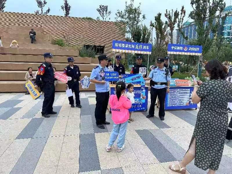 近日,公安榆阳分局新明楼派出所在辖区人员密集场所凌霄广场、夫子庙开展反电信网络诈骗宣传工作。