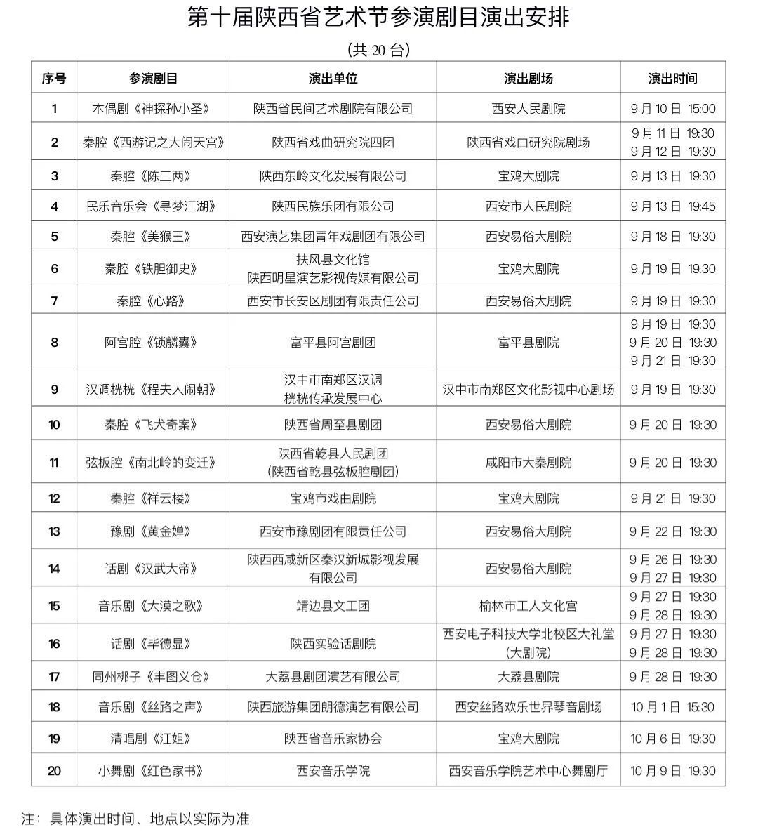 参演剧目1部:音乐剧《大漠之歌》,计划于9月27日、28日19:30在榆林市工人文化宫演出。