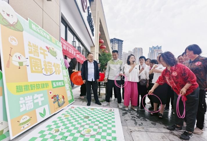 与往年不同的是,今年的粽子需要通过套粽子趣味游戏来获得,吸引了很多居民参与和围观,“低一点,瞄准,扔……”在大家的帮忙和掌声中,参与者们纷纷将美味的粽子收入囊中。(记者 谢妮妮 张娟娟)