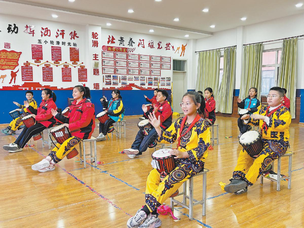 定边县田园小学非洲鼓社团课堂。柳芳 摄