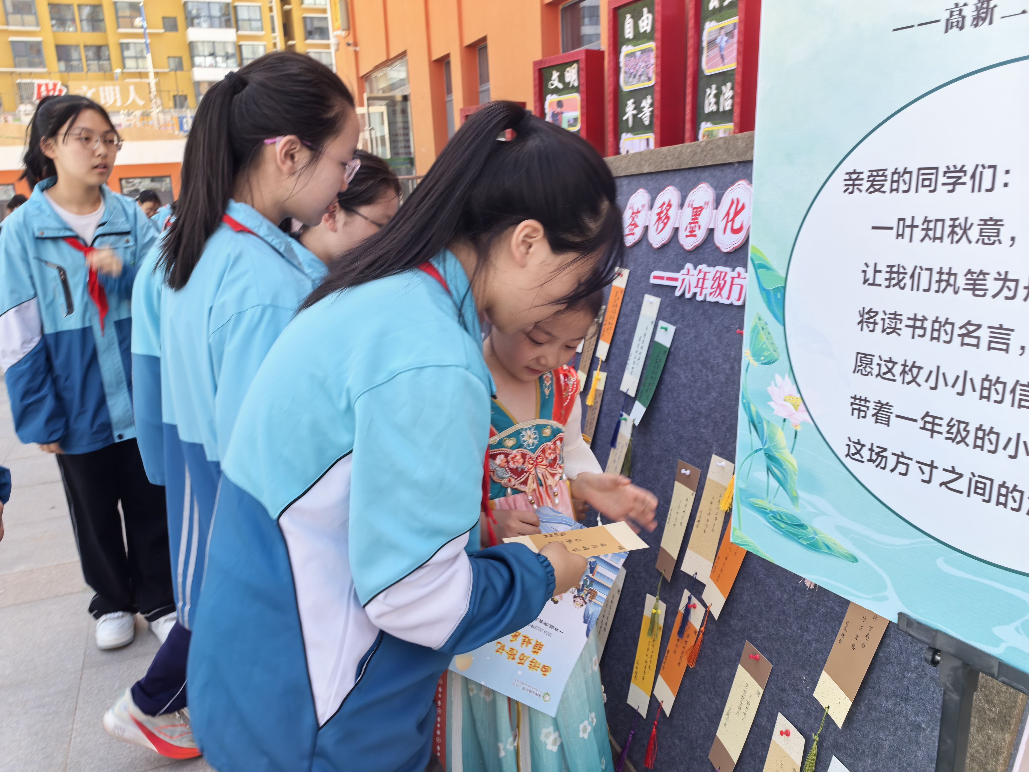 古诗游园里,一年级孩子们在“古诗转转盘”活动中,背诵出《使至塞上》、《商山早行》等经典诗句,用稚嫩的童声传递诗词之美。而一旁的书签区,学生们选取精美的书签并书写上诗句,寄托读书志向,感受读书乐趣。随后,各年级以班为单位,开展成语大闯关、寓言故事会、图书漂流等不同形式的活动展现读书的魅力。读书漂流活动课堂上,同学们化身为“好书推荐官”,以趣味猜谜的方式推荐书籍,并与同伴交换阅读。在互动中,不仅增进了对不同书籍的了解,更在交流中碰撞出思维的火花,感受阅读魅力。